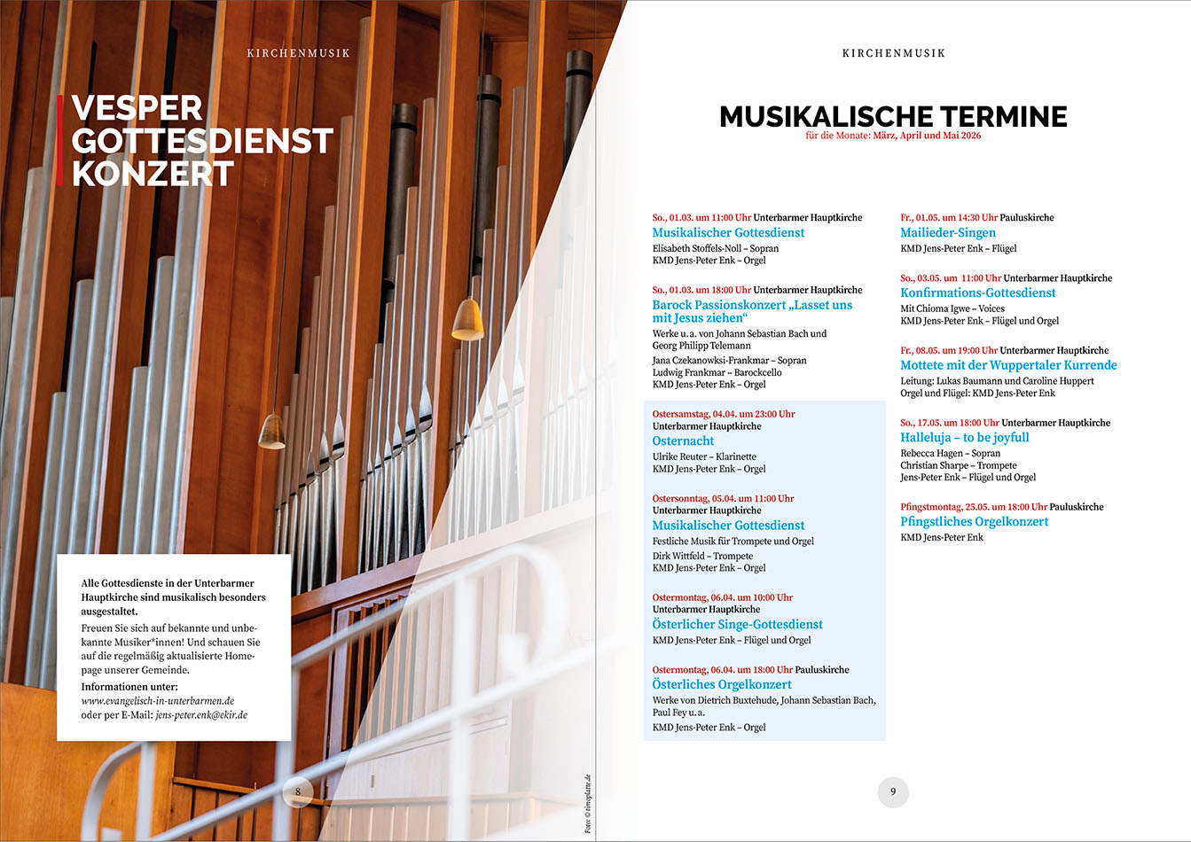Alle Gottesdienste in der Unterbarmer Hauptkirche sind musikalisch besonders ausgestaltet. Darüber hinaus finden zahlreiche Konzerte in unserer Kirche statt, zu denen Sie herzlich eingeladen sind. Freuen Sie sich auf bekannte und unbekannte Musiker*innen!